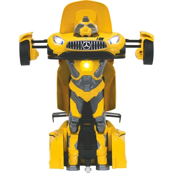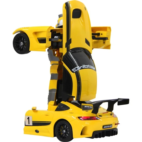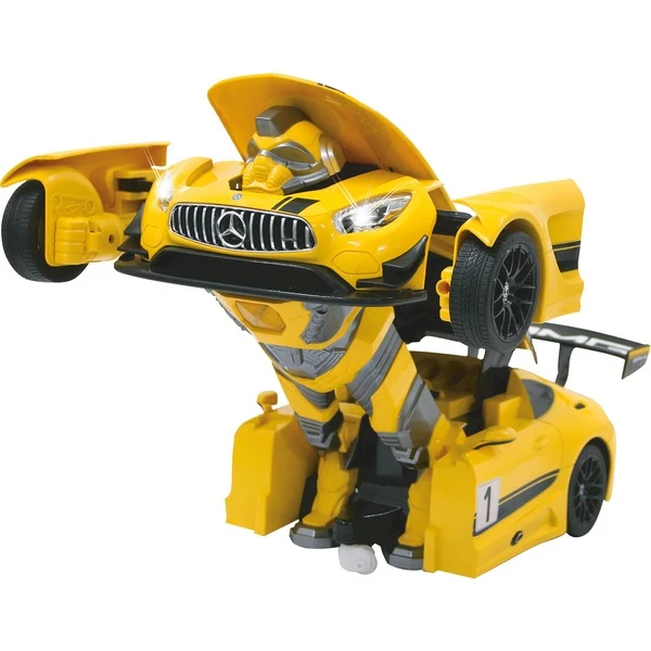 Der Mercedes AMG GT3 transformable in gelb ist ein transformierbar ferngesteuertes Auto von Jamara im Maßstab 1:14. Er wird über eine 2-Kanal Fernbedienung mit 2 Zusatzfunktionen im 2,4 GHz Funknetz gesteuert und kann sowohl im Außen- wie auch im Innenbereich manövriert werden. Er fährt vorwärts und rückwärts sowie nach links und rechts. Die Fahrzeit beträgt bis zu 45 Minuten. Auf Knopfdruck lässt sich der GT3 kinderleicht zu einem Roboter verändern. Beiliegen dazu gibt ein Schild und eine Streitaxt. Außerdem überzeugt das Spielzeug mit einem Tanzmodus, Lautsprecher und einer Einzelradaufhängung.Art.-Nr.: 1326152
