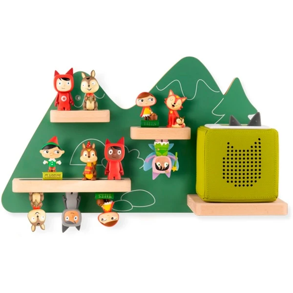 Das Tonie Regal “Auf zum magischen Berg” in der Farbe Waldgrün ist die perfekte Bühne für die Tonie-Sammlung. Dabei ist es viel mehr als ein dekoratives Wandregal: Es ist eine moderne Bibliothek, die entworfen wurde, um die Lieblings-Tonies, die Toniebox und ihre Ladestation unterzubringen. Auf dem waldgrünen Berg steht eines auf jeden Fall fest: Die Expeditioncrew des Hör-Spiel-Spaßes. Süße Motive aus der Tonie-Welt machen den bezaubernden Blickfang zum einzigartigen Hingucker in jedem Kinderzimmer. Bis zu 20 Tonies stehen oder hängen sicher auf den magnetischen Holzflächen. Die Toniebox hat ihren eigenen Platz mit Öffnung und Vertiefung für ihre Ladestation. Das Regal lässt sich schnell und einfach an der Wand montieren, die passenden Schrauben und Dübel sind dabei.Art.-Nr.: 1918275